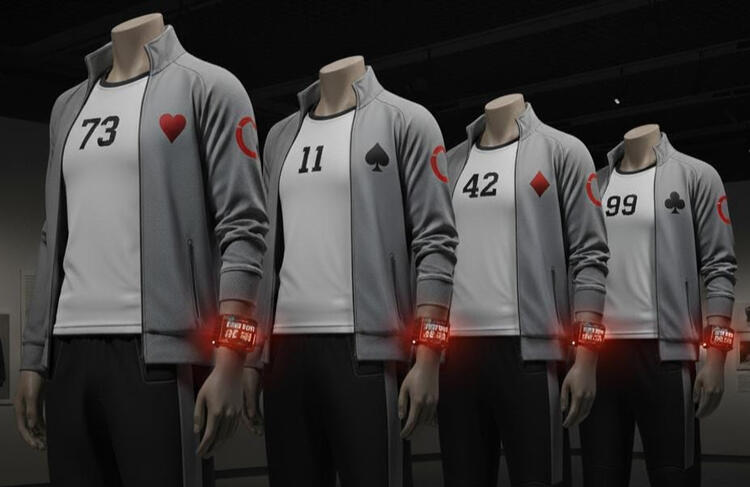 Por cima, em dias de frio ou em eventos oficiais, os jogadores recebem um casaco leve cinza, com o número repetido nas costas em vermelho. O sÃmbolo de Lethe, um cÃrculo incompleto, é estampado na manga esquerda.O detalhe mais importante, porém, é a pulseira eletrônica: Feita de um material metálico e escuro, presa firmemente ao pulso direito. Seu visor exibe o número de dias restantes do visto e os pontos acumulados, que brilham em vermelho pulsante.O brilho da pulseira é inconfundÃvel nas sombras da cidade, um lembrete constante de que o tempo em Lethe nunca está a favor de ninguém.